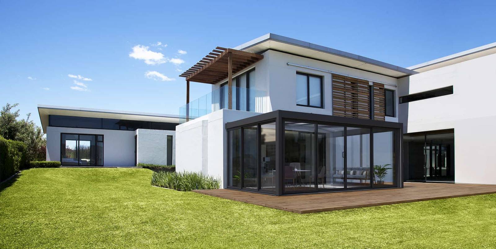Les châssis en aluminium de 80 mm et les vitrages de 28 mm au gaz argon garantissent des performances exceptionnelles. La véranda est ainsi habitable tout au long de l'année grâce aux ouvrants coulissants étanches. Des équipements de confort tels que des stores de toit, des volets roulants et des éclairages en font un espace de vie agréable.